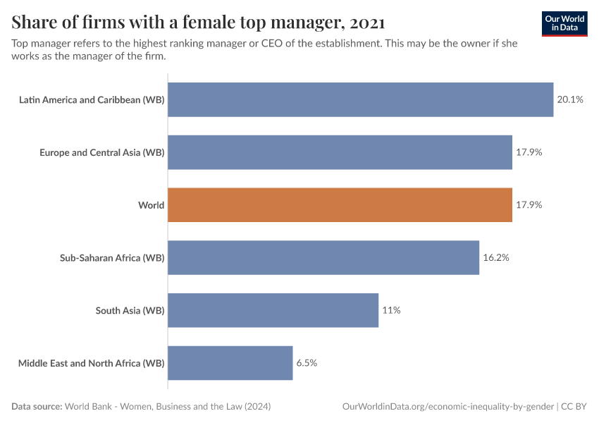 The next chart provides an alternative perspective on the same issue. Here we show the share of firms that have a woman as manager. We highlight world regions by default, but you can remove them and add specific countries.