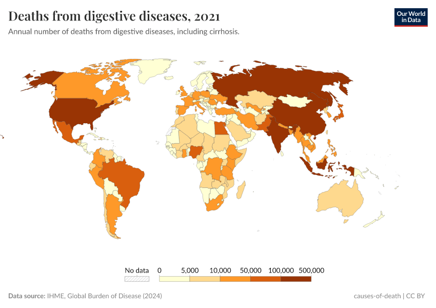 IHME, Global Burden of Disease (2024) – with minor processing by Our World in Data. “Deaths from digestive diseases” [dataset]. IHME, Global Burden of Disease, “Global Burden of Disease - Deaths and DALYs” [original data]. Retrieved July 11, 2025 from https://data-oecd-affordable-housing.owid.pages.dev/grapher/deaths-from-digestive-diseases