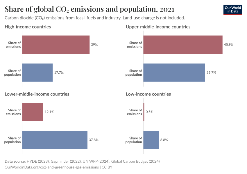 Instead, we see that high- and upper-middle income countries account for a much larger share of emissions than their population. Despite being home to just under half of the world population, they emit more than 80% of world’s CO2.
