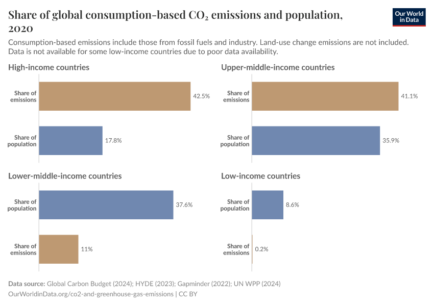 The emissions shares of lower-middle and especially low-income countries could be slightly underestimated; this is because consumption-based emissions cannot be calculated for some poorer countries due to poor data availability.
